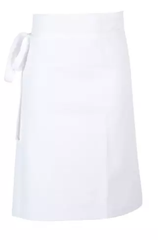 Tablier de cuisine durable en coton 100 %, blanc, de dimensions 105 cm (largeur) × 60 cm (hauteur), avec ceinture lacet de 100 cm. Disponible également en noir (100 % coton), et en versions polyester-coton en gris clair et marine.