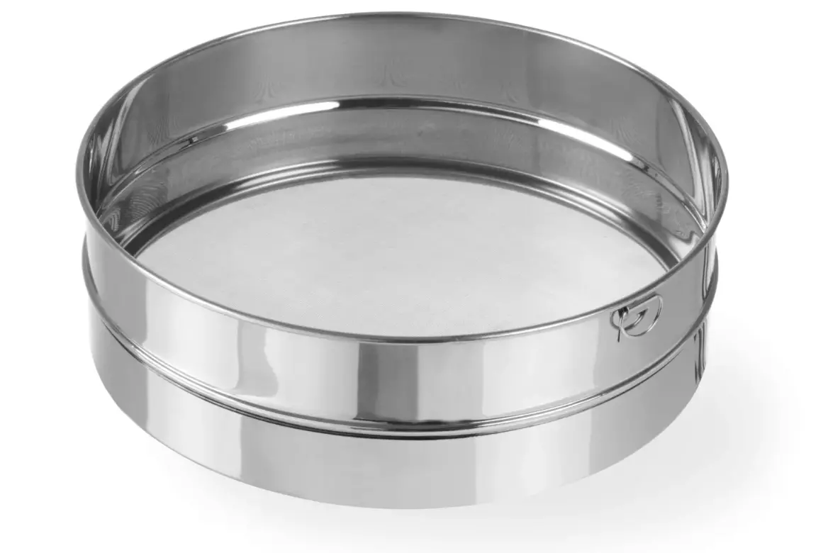 Tamis professionnel en acier inox, diamètre 410 mm et hauteur 80 mm, idéal pour tamiser la farine et autres poudres fines.