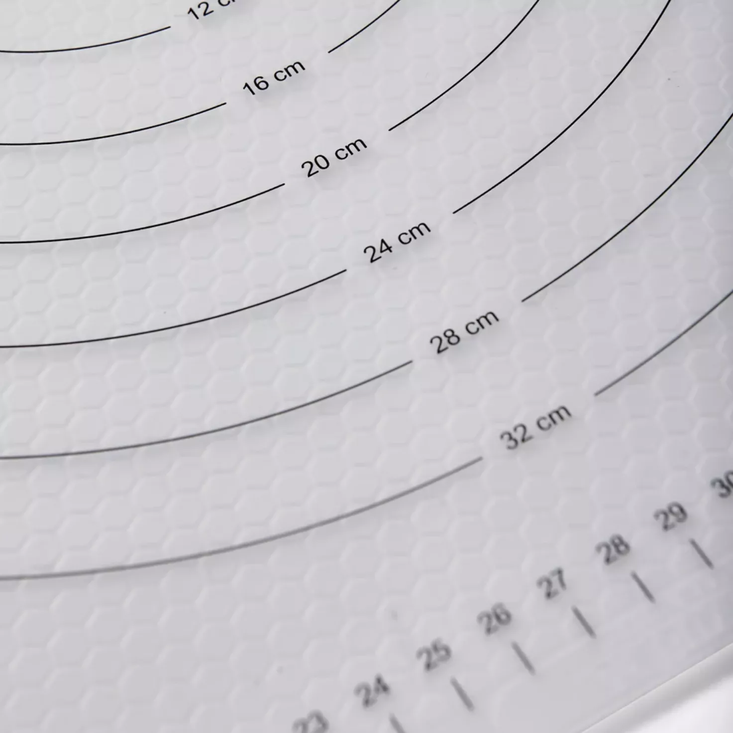 Grâce à ses repères imprimés qui indiquent les diamètres — notamment 12, 16, 20, 24, 28 et 32 cm — ce tapis facilite le dosage exact du développé de pâte nécessaire pour vos préparations et vous aide à obtenir des résultats réguliers.
