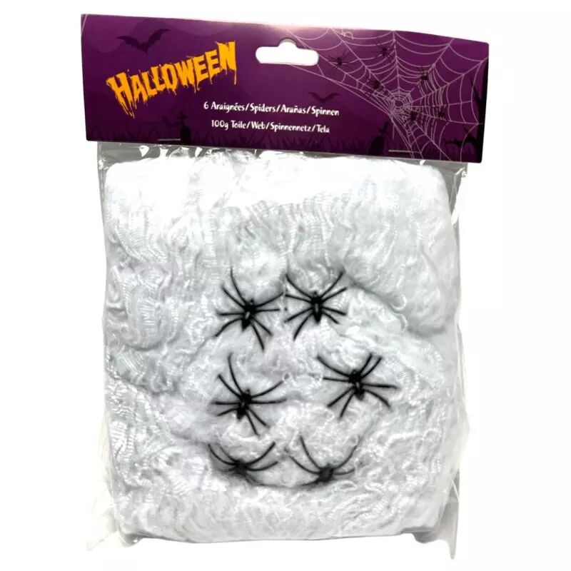 Accueil > ÉVÉNEMENTS > FESTIVITÉS > HALLOWEEN > TOILE D ARAIGNEES 100G + 6 ARAIGNEES